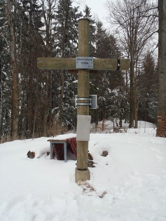 Ein Kreuz auf dem Gipfel eines Berges dient nicht nur als Markierung der höchsten Stelle, sondern auch als religiöses Zeichen des Glaubens. Am 22. April 2001, einem sogenannten „Klein-Ostersonntag“ oder auch „Weißen Sonntag“, konnte Franz Waidacher sein wohlüberlegtes und Gott dargebrachtes Versprechen einlösen, wobei ihn Verwandte und Nachbarn unterstützten. Schon am Vortag hatte der Genesene ein Loch in den schneebedeckten, steinigen Boden des Gipfels in Schönegg gegraben. Auf seinem Hof betonierte er einen Sockel, Schwiegervater Johann Barth brachte die erforderlichen Eisenteile in Form und Nachbar Josef Friedam besorgte die wetterbeständigen Rundhölzer bei der Firma Mohik Wertholz in Schrauding. Alle Teile wurden daraufhin mit dem Schlitten auf den Hochtrötsch transportiert, um das Kreuz mit einer Höhe von 2,50 m und einer Breite von 1,80 m im Einvernehmen mit der Alpenvereinssektion Frohnleiten zusammenzubauen. Der bereits vorhandene Behälter für das Gipfelbuch und ein Schild wurden am Kreuz befestigt. Der begeisterte Bergwanderer Felix Köhldorfer (+ 22. Dezember 2011) stellte später noch ein Ruhebankerl auf diesem idyllischen Platz zur Verfügung. Es ermöglicht eine klassische Gipfelrast mit einem wunderbaren Blick, der zum Nachdenken einlädt. In unmittelbarer Nähe steht am Wanderweg 750 noch das Rüsterkreuz, am Niedertrötsch das Friedenskreuz und am Fuße des Berges ein Leonhard-Bildstock.